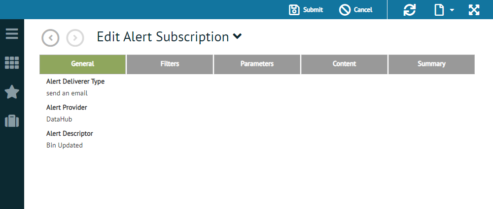 When you are finished making changes, click the Submit control on the action bar to save the alert and exit the editor.